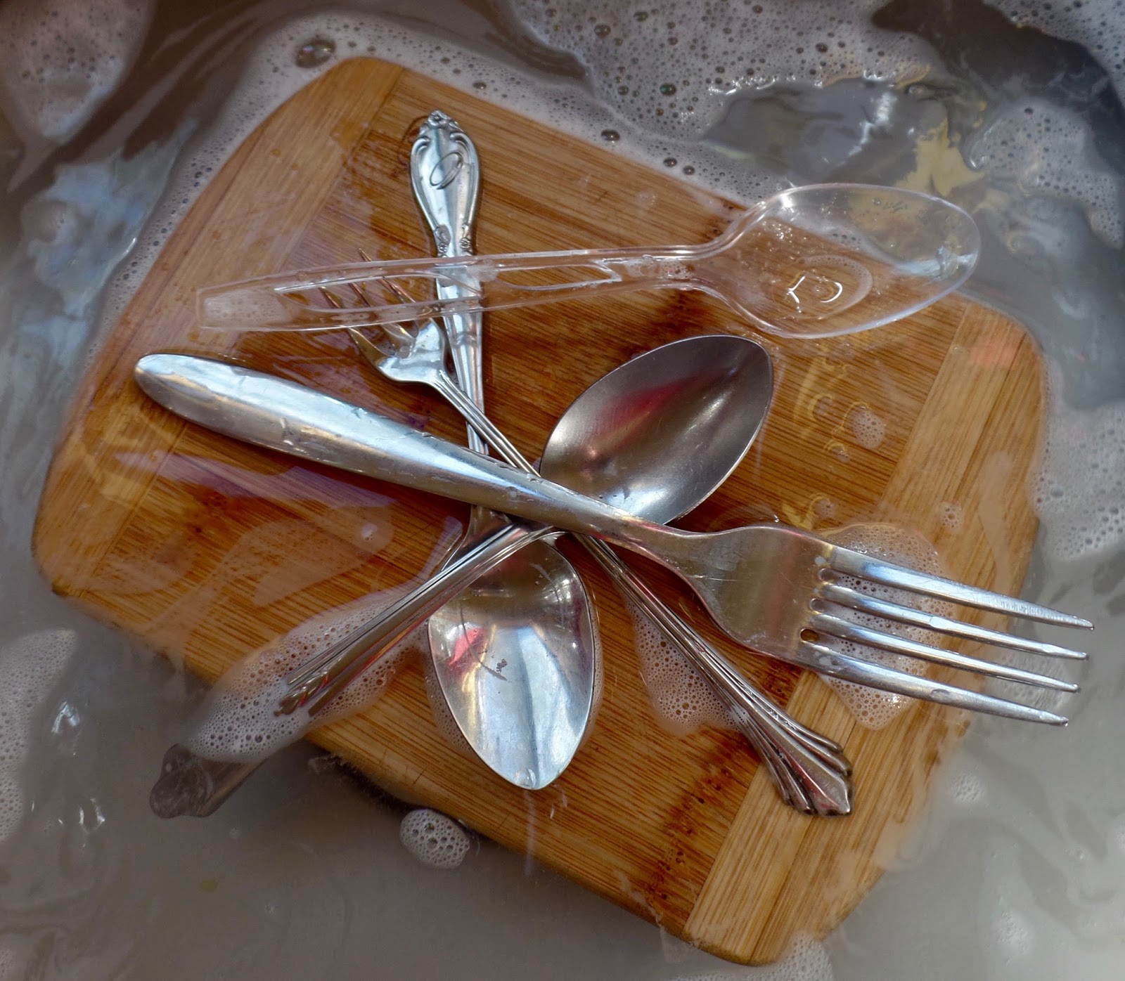 Therapy comes in all shapes and sizes, and at widely varying cost, from big bucks at the therapist’s air-conditioned office, to free, while pot-walloping. I posted this goofy photo on face/book this morning, of silverware piled on a little cutting board, floating in the soapy dishwater.